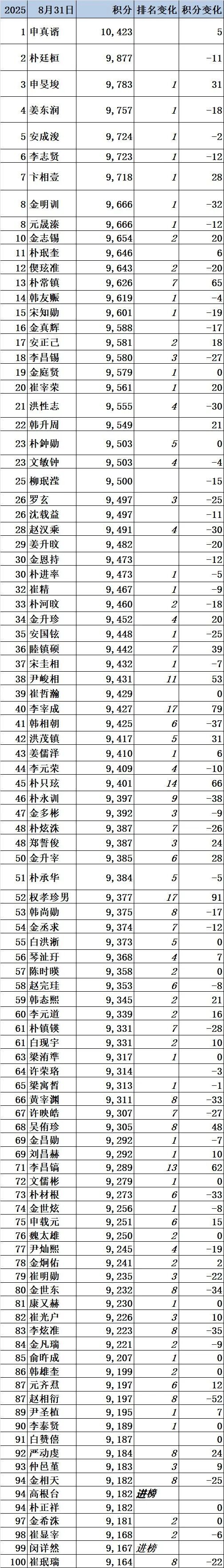 上升一个名次的申旻埈九段在12个月后重返第三位。8月2胜,31分。安成浚九段也上升一位升至第五位。