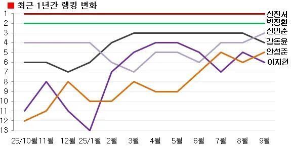 右侧从高到低依次:申真谞,朴廷桓,申旻埈,姜东润,安成浚,李志贤,排名第7的卞相壹未列其中。